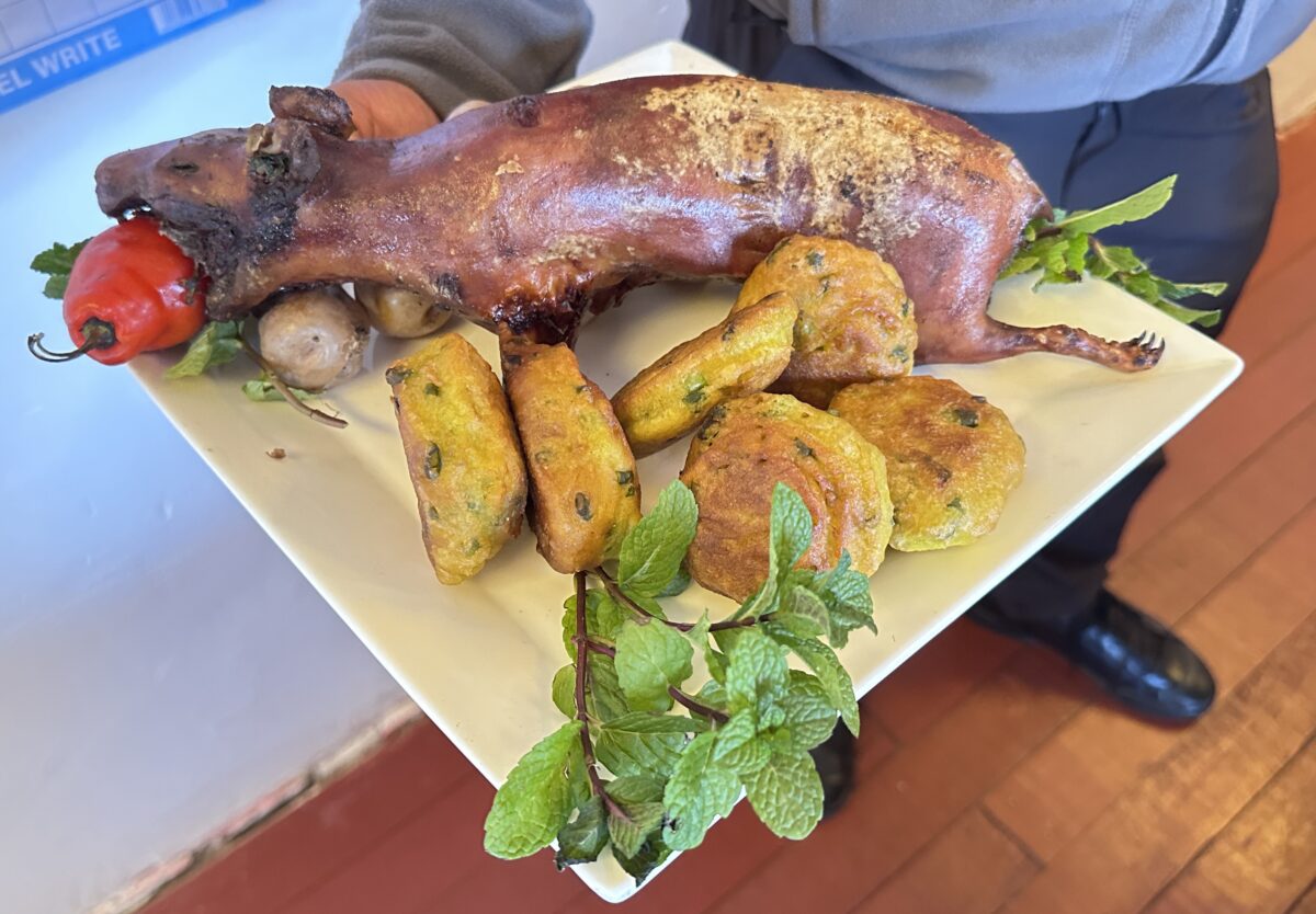 Chinchero is typically rather relaxed, but Sundays—market days—are quite lively, with dealers offering local crafts and farm products. We stopped at a dealer of shawls and textile products, and were treated to a demonstration of applying natural dyes to Alpacan wool. Alpacas were available for petting. So was a pen of cute guinea pigs, destined, alas, for someone’s dinner table—a delicacy in Peru. Also, you cannot miss the traditional dress of ladies in braids and in hats walking through the streets here. Andean weaving is featured throughout the Sacred Valley—nowhere more so than in Chinchero.